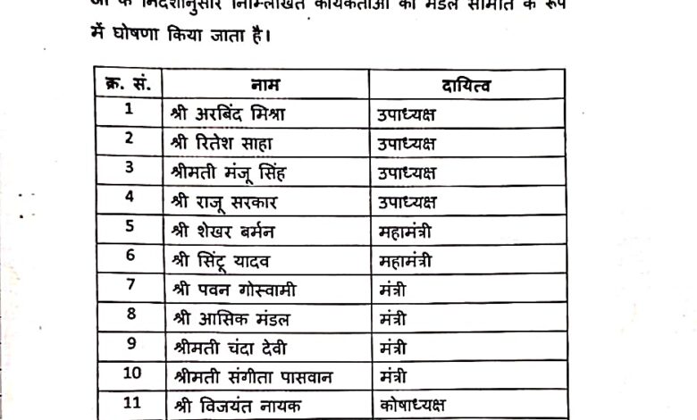 घोषित कार्यसमिति में विभिन्न पदों पर कार्यकर्ताओं को जिम्मेदारी सौंपी गई है। उपाध्यक्ष पद पर अरविंद मिश्रा, रितेश साहा, मंजू सिंह एवं राजू सरकार को नियुक्त किया गया है। वहीं महामंत्री के रूप में शेखर बर्मन एवं सिंटू यादव को जिम्मेदारी दी गई है।