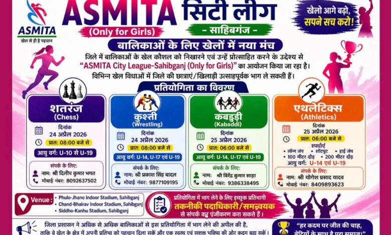 साहिबगंज में ‘स्मिता सिटी लीग’ का आगाज 24–25 अप्रैल को, बालिकाओं के लिए चेस, कुश्ती, कबड्डी व एथलेटिक्स प्रतियोगिताएं आयोजित।